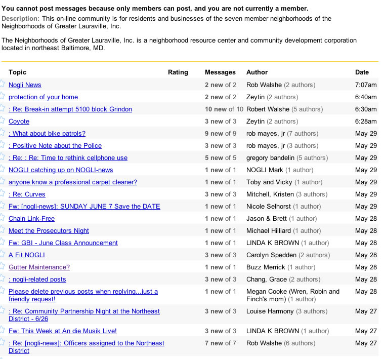 You will see below a screen-shot of another neighborhood discussion group, the Nogli (don’t ask) neighborhood group. Each line is a “post,” a message submitted by a member. Each line lists the topic, the number of replies, and the chosen nickname of the original author. (If you wish to see the web site and examine their neighborhood issues, go to: http://groups.google.com/group/nogli-news/topics)